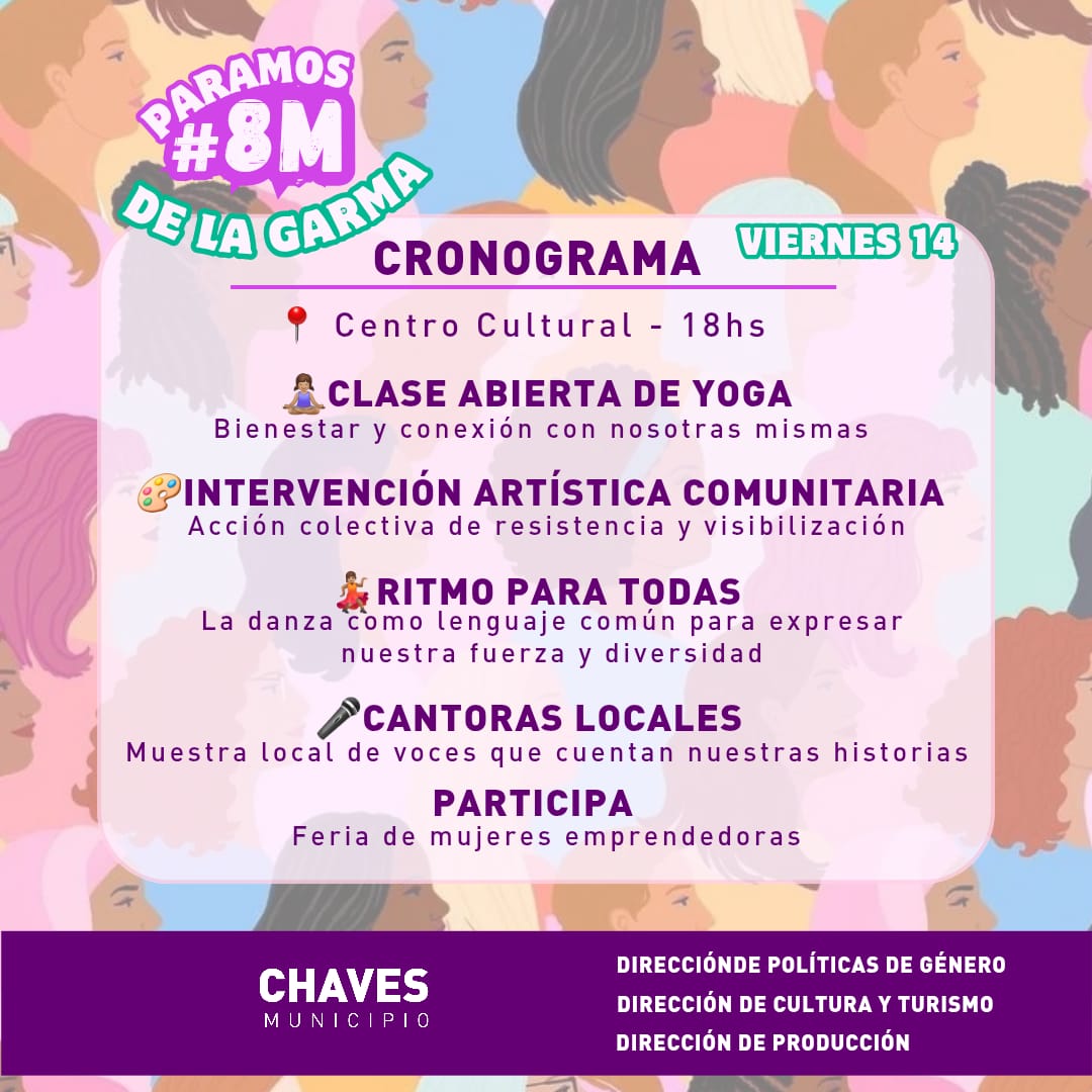 Finalmente, el viernes 14 de marzo, en la localidad de De la Garma, a las 18:00 hs., se llevará a cabo una jornada cargada de significado y expresión colectiva en el Centro Cultural. Las actividades comenzarán con una clase abierta de yoga, orientada al bienestar y la conexión con nosotras mismas, promoviendo un espacio de introspección y cuidado personal. A continuación, se realizará una intervención artística comunitaria, concebida como una acción colectiva de resistencia y visibilización, que destacará el poder transformador del arte. Sumándose a esta propuesta, se presentará «Ritmo Para Todas», una experiencia en la que la danza se convierte en un lenguaje común para reflejar nuestra fuerza, diversidad y unión. En este marco, también participarán cantores locales, cuya música y letras serán una muestra viva de nuestras historias y tradiciones, fortaleciendo el sentido de comunidad y pertenencia. Este evento promete ser un encuentro único para celebrar la resiliencia y expresión de las mujeres en un ambiente de unión y creatividad.
