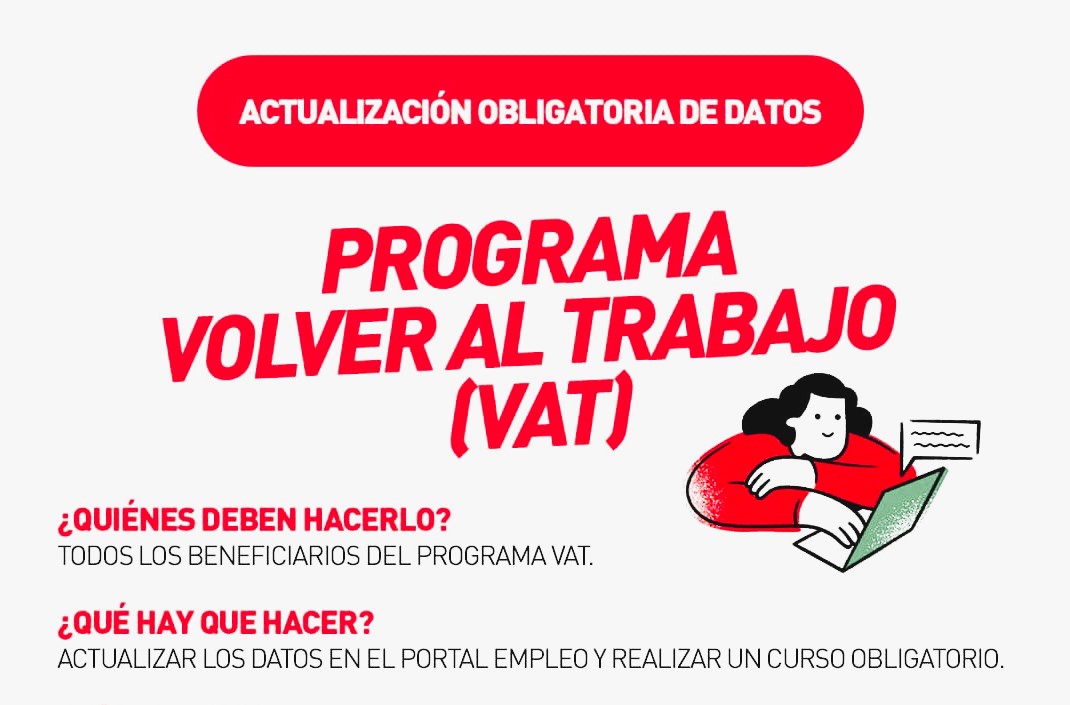 La Subsecretaria de Desarrollo Económico, Social y Comunitario informa a los beneficiarios del Programa VAT (Volver al Trabajo – EX POTENCIAR) que deben actualizar sus datos a través del Portal Empleo. Este proceso incluye la realización de un curso obligatorio y la validación de datos.