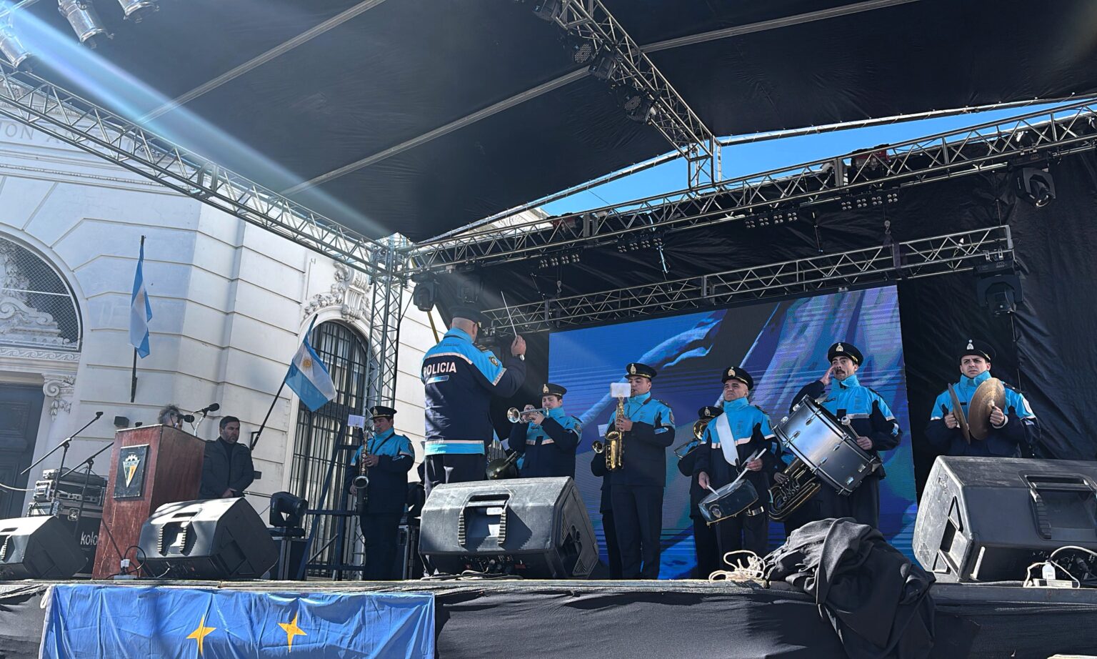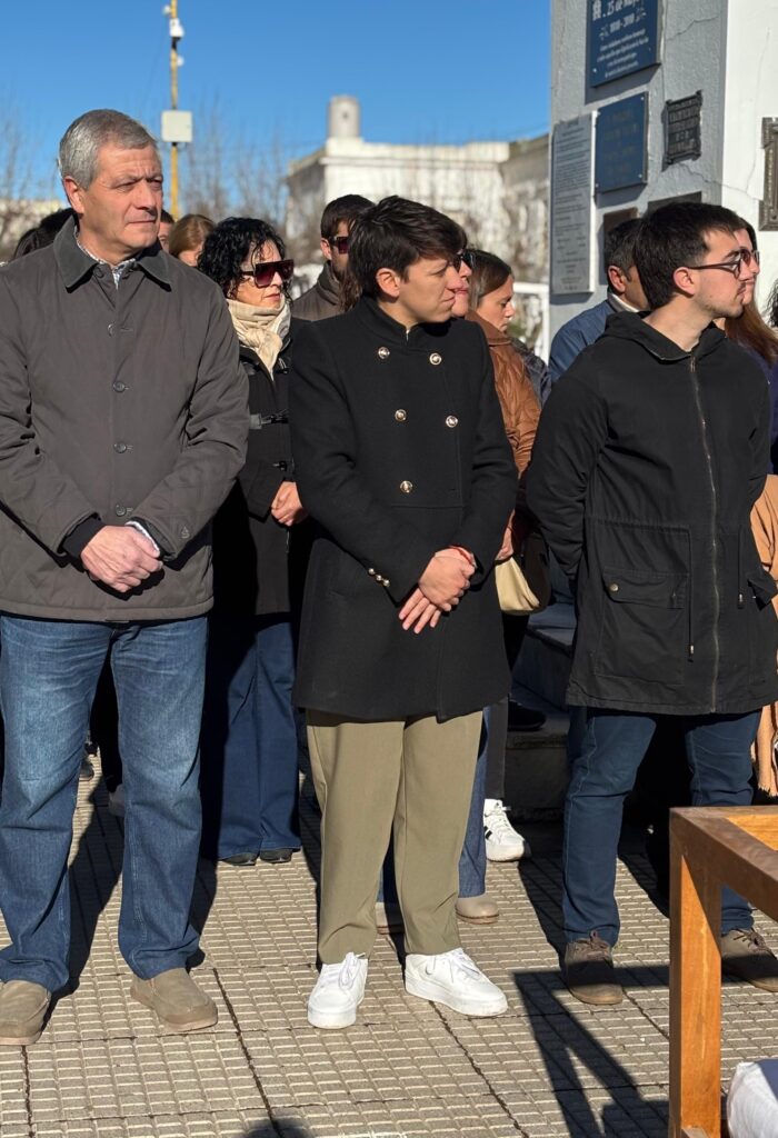 El acto oficial comenzó por la mañana con el izado de la bandera en la Plaza 25 de Mayo, encabezado por la intendenta Lucía Gómez, acompañada por autoridades, concejales de ambos bloques, representantes de instituciones, ex intendentes —entre ellos Daniel Vissani y Marcelo Santillán— y una gran concurrencia de la comunidad.