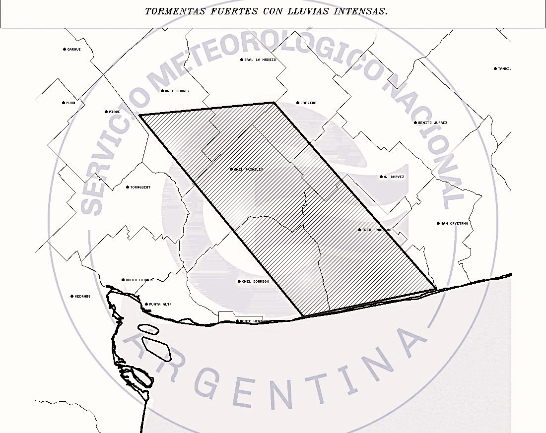 El Servicio Meteorológico Nacional (SMN) ha emitido un aviso de alerta por tormentas fuertes con lluvias intensas, afectando parcialmente los siguientes partidos: Adolfo Gonzales Chaves, Coronel Dorrego, Coronel Suárez, Coronel Pringles, General Lamadrid, Laprida y Tres Arroyos.