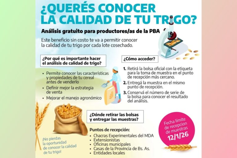 La iniciativa para la campaña 2025/26, permite a productores bonaerenses analizar su cereal de manera gratuita y anónima, generar información estratégica para la comercialización y fortalecer el posicionamiento del trigo provincial en los mercados.
