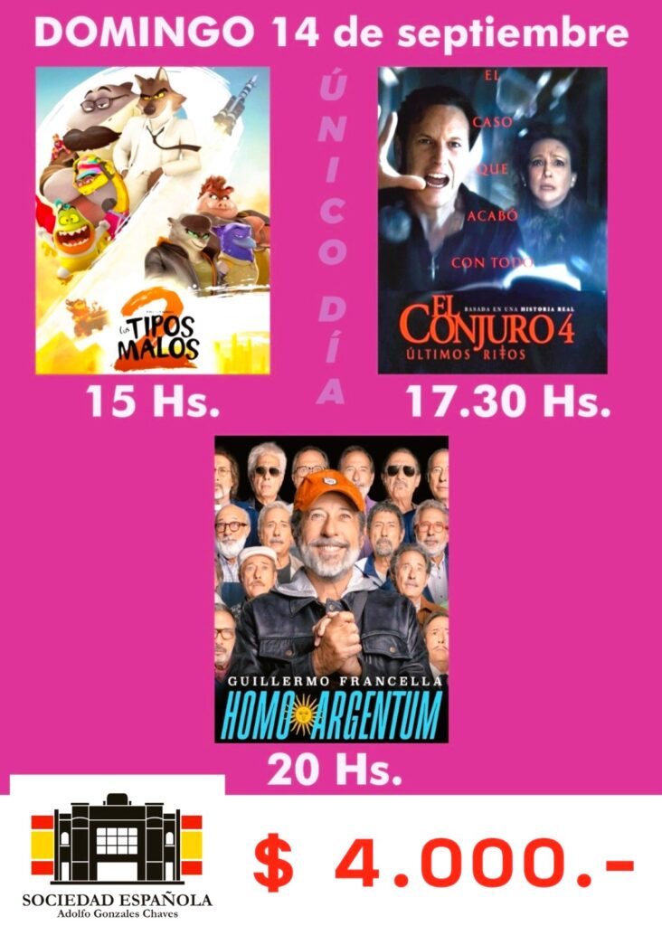Además, continúan las actividades culturales: el Taller de Memoria y Estimulación Cognitiva, todos los martes de 17:00 a 18:00 hs, con inscripciones abiertas hasta el 1 de septiembre; y el Cine Comercial, el 14 de septiembre con distintas funciones a lo largo del día, presentando Tipos Malos 2 a las 15:00 hs., El Conjuro 4 a las 17:30 hs., y el éxito argentino Homo Argentum a las 20:00 hs., protagonizado por Guillermo Francella.