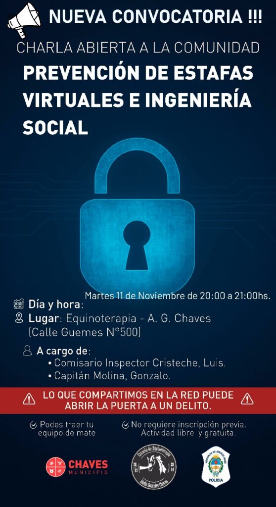 Adolfo Gonzales Chaves — El próximo martes 11 de noviembre, de 20 a 21 horas, se llevará a cabo una nueva edición de la convocatoria para participar de la Charla Abierta a la Comunidad”, enfocada en la prevención de estafas virtuales e ingeniería social, una problemática cada vez más presente en la vida cotidiana.
