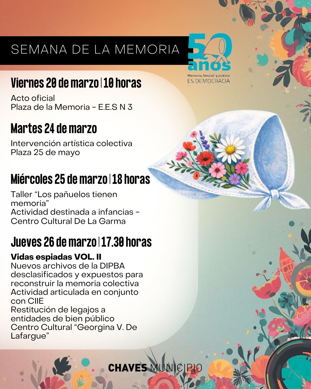 - Viernes 20 de marzo | 10:00 hs Acto oficial Lugar: Plaza de la Memoria – E.E.S N° 3