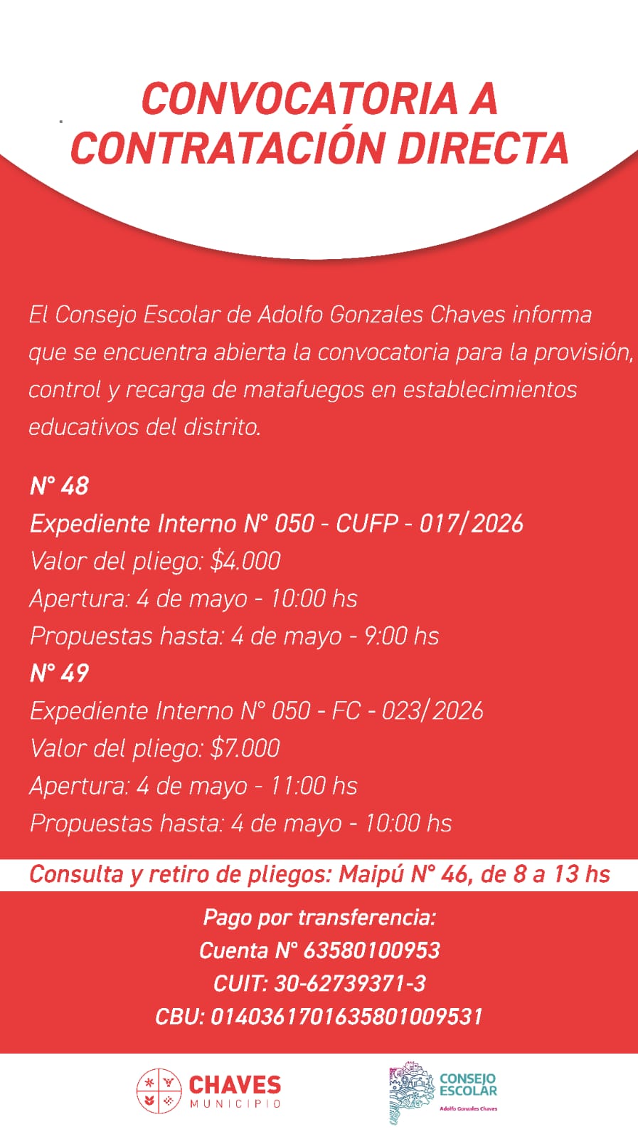 El Cuerpo de Consejeros Escolares del Distrito de Adolfo Gonzales Chaves informa que se encuentra abierta la convocatoria para participar de los procesos de Contratación Directa – Factura Conformada N° 48 y Contratación Directa – Factura Conformada N° 49, destinados a la contratación del servicio de provisión, control y recarga de matafuegos para establecimientos educativos del distrito.