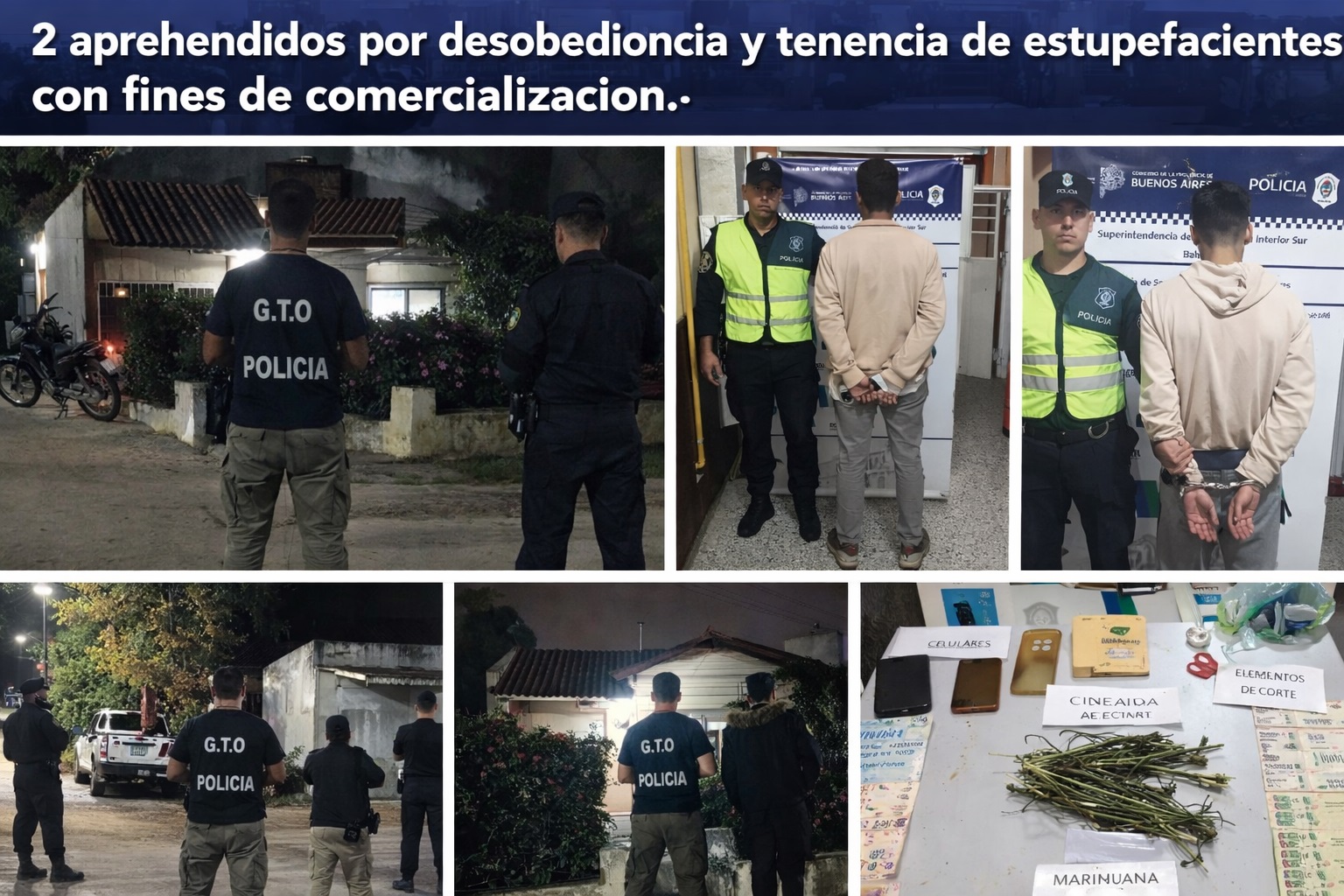 En De la Garma, este domingo 12 Cte., en horas de la noche, personal Policial del Destacamento de De La Garma, procedieron a la detención de SAAVEDRA SAN ROMAN DANILO y LAUTARO FEDERIZZI, ambos mayores de edad y residentes de la localidad de La Garma, en circunstancias que fueron identificados en el marco de Operativos dispuestos por la superioridad, donde los mismos al ser interceptados mientras circulaban en motocicleta, intentaron darse a la fuga y siendo rápidamente interceptados, se resisten al proceder policial, finalizando los mismos aprehendidos por Desobediencia y Resistencia a la Autoridad. Sobre los mismos al momento de ser requisados se les halló en su poder marihuana por un total 14 gramos, junto con elementos de corte y fraccionamiento.