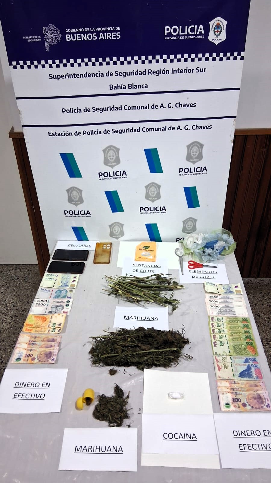Dado que uno de ellos se encontraba sindicado en una investigación previa por el mismo delito, causa que lleva adelante el Dr. Juan Carlos Ustarroz titular de la Ayudantía Fiscal de A. Gonzales Chaves, se ordenó en forma inmediata un allanamiento de urgencia en los domicilios de los aprehendidos, a saber: Paso y Bustamante de De La Garma, residencia de SAAVEDRA SAN ROMAN DANILO, donde se logró el secuestro de un total de 190 Gramos de Cannabis Sativa (Marihuana) un teléfono celular Motorola, E13, recortes de nylon para fraccionamiento y elementos corte. Mientras que sobre el 2 domicilio sito Av. Victor H. Barrera Nro. 36, residencia de FEDERIZZI LAUTARO, se logró el secuestro de un plato con restos de Cocaina, y elementos de corte y fraccionamiento para dicha sustancia estupefaciente y demás elementos de interés para la causa.