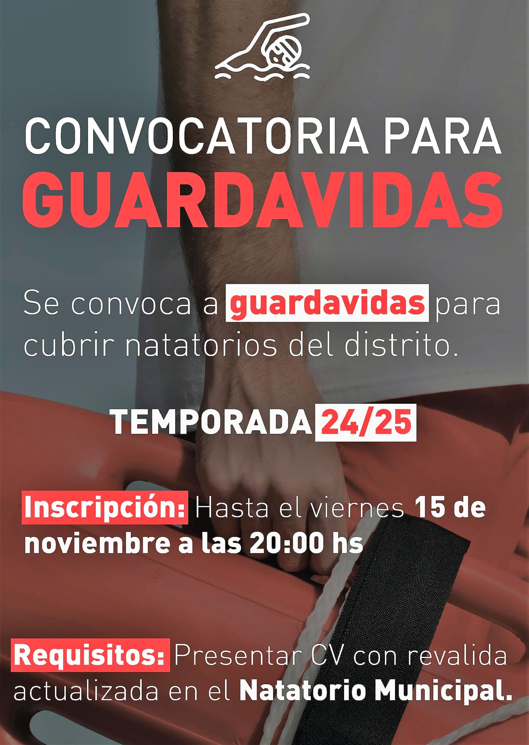 Chaves Municipio anuncia una convocatoria dirigida a guardavidas para cubrir los natatorios del distrito durante la temporada 2024/2025. La inscripción estará abierta hasta el viernes 15 de noviembre, a las 20:00 horas. Los interesados deberán presentar su currículum vitae junto con la revalida actualizada en el Natatorio Municipal.