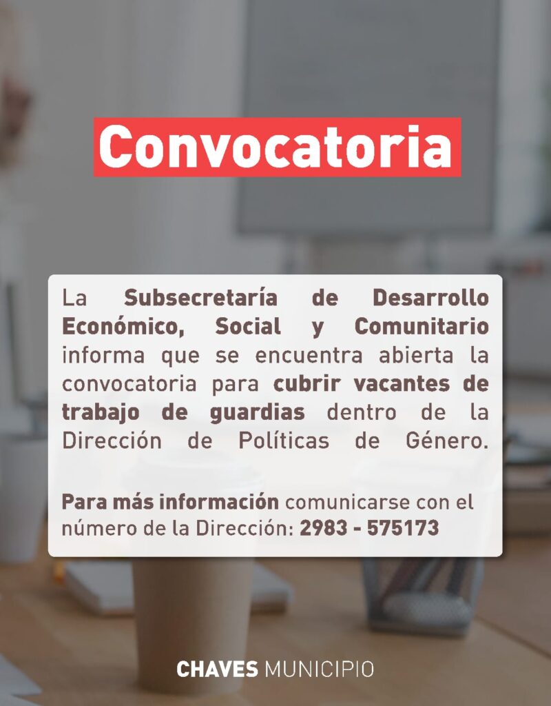 Desde Chaves Municipio se informa la apertura de dos importantes convocatorias laborales con el objetivo de reforzar áreas clave de atención y acompañamiento a la comunidad. Una de las búsquedas está a cargo de la Subsecretaría de Desarrollo Económico, Social y Comunitario, mientras que la otra es impulsada por la Dirección de Políticas de Género.