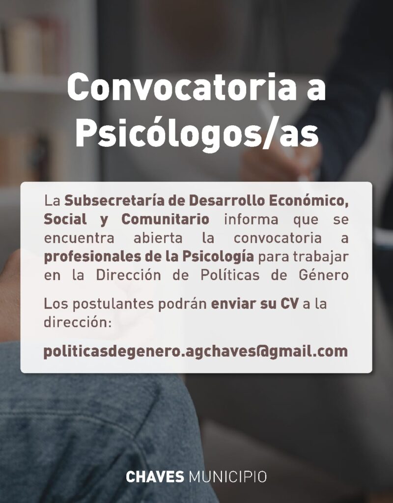 Por otro lado, la Dirección de Políticas de Género convoca a profesionales de la Psicología que deseen sumarse a su equipo de trabajo. Los postulantes deberán enviar su CV al correo electrónico politicasdegenero.agchaves@gmail.com.