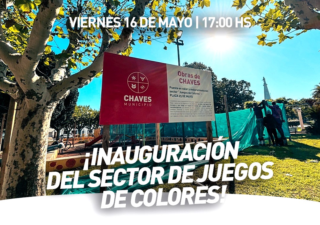 El próximo viernes 16 de mayo a las 17:00 horas, Chaves Municipio invita a todas las familias a ser parte de la inauguración del nuevo sector de juegos de colores en la Plaza 25 de Mayo.