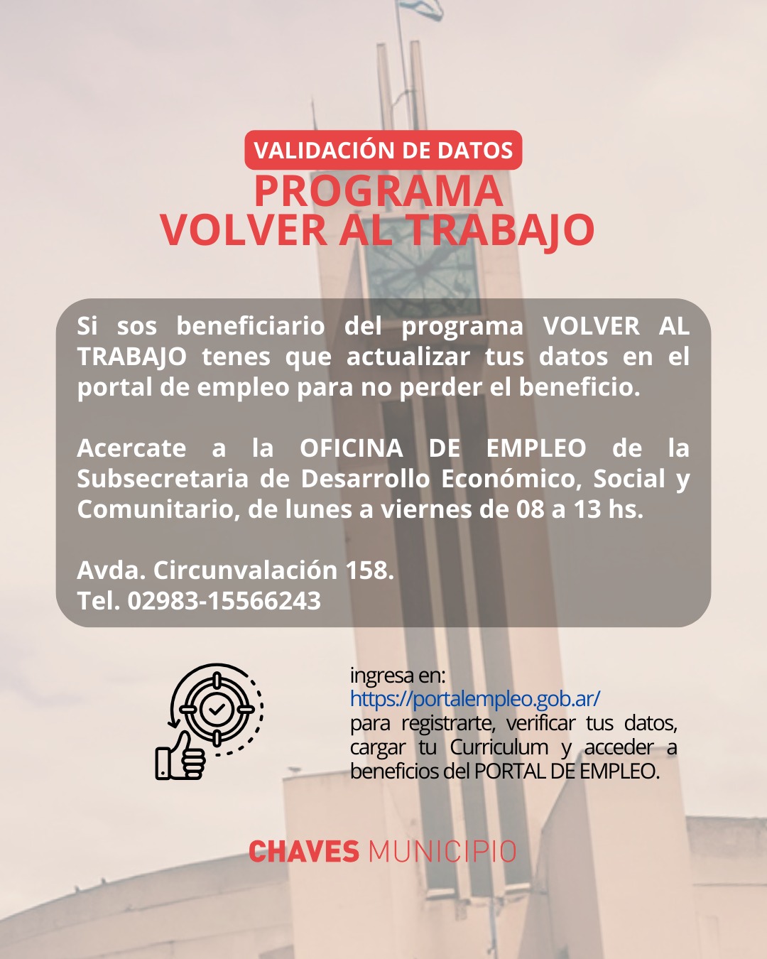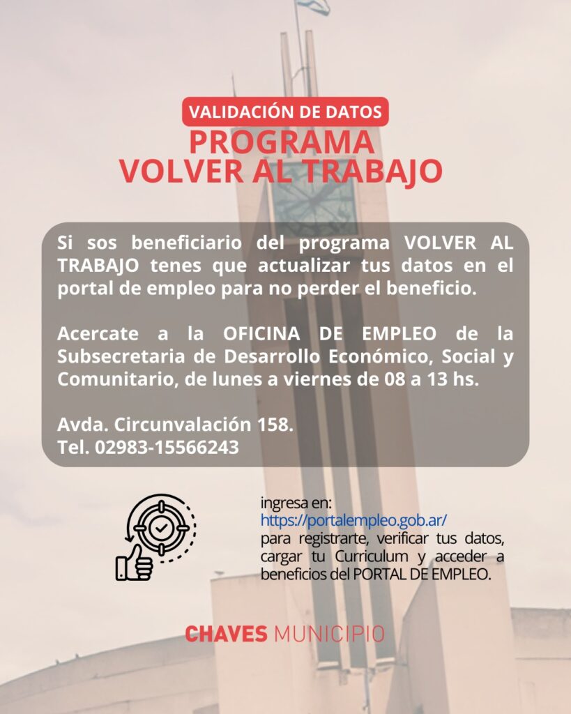 Chaves Municipio informa a los beneficiarios del Programa “Volver al Trabajo” que deben realizar la actualización de sus datos en el Portal de Empleo para no perder el beneficio. Este procedimiento es obligatorio y está orientado a garantizar la continuidad del programa y el acceso a las herramientas que ofrece.