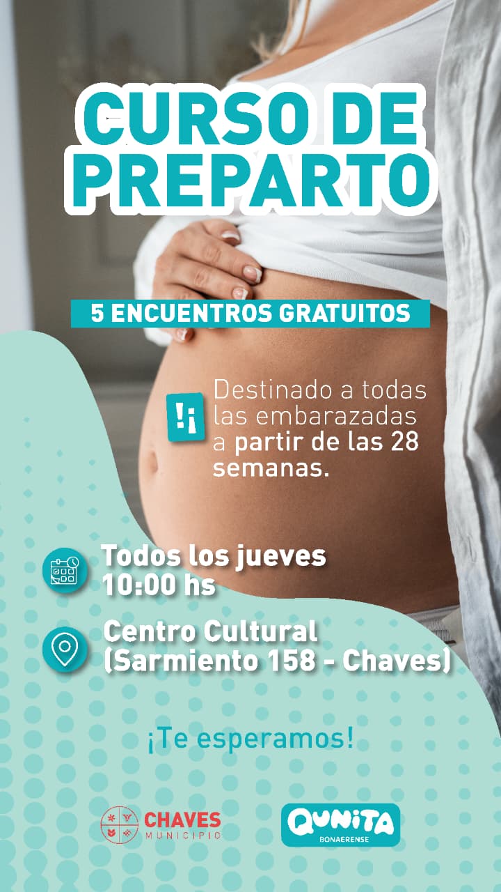 Desde Chaves Municipio, en coordinación con el Plan Qunita Bonaerense, se informa que se encuentra disponible un curso de preparto gratuito destinado a todas las embarazadas a partir de las 28 semanas de gestación.