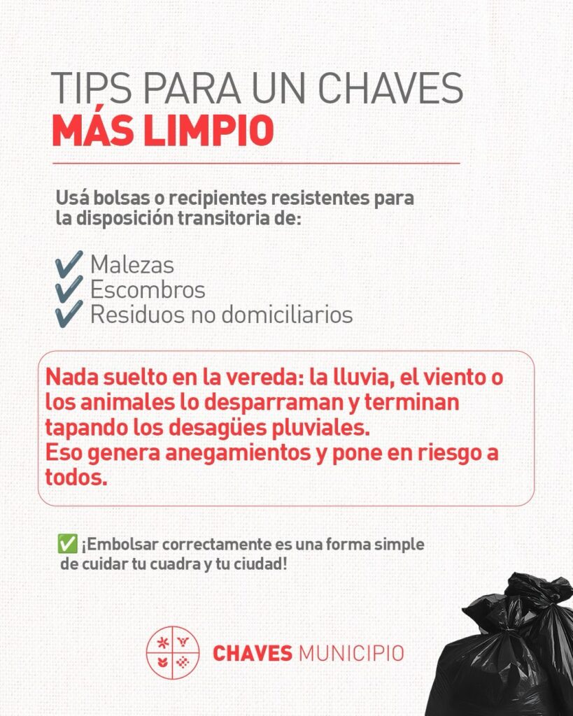 Desde Chaves Municipio se puso en marcha una campaña de concientización para promover la correcta disposición de residuos no domiciliarios, como malezas, escombros y restos de poda.