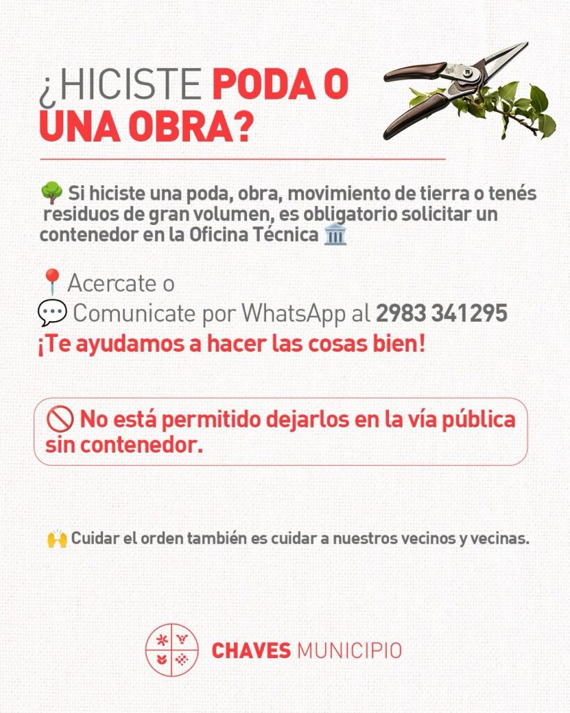 En el caso de residuos de gran volumen, como podas, movimiento de tierra u obras, es obligatorio solicitar un contenedor a la Oficina Técnica. Para ello, se puede concurrir personalmente o comunicarse por WhatsApp al 2983 341295.