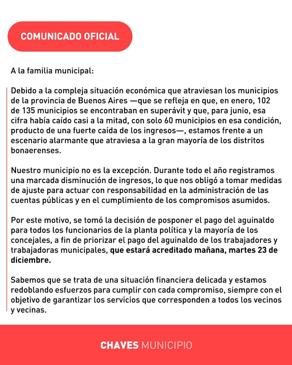 Adolfo Gonzales Chaves. Chaves Municipio informó que, en el marco de la compleja situación económica que atraviesan los distritos de la provincia de Buenos Aires, se tomó la decisión de priorizar el pago del aguinaldo a los trabajadores y trabajadoras municipales, el cual será acreditado este martes 23 de diciembre.