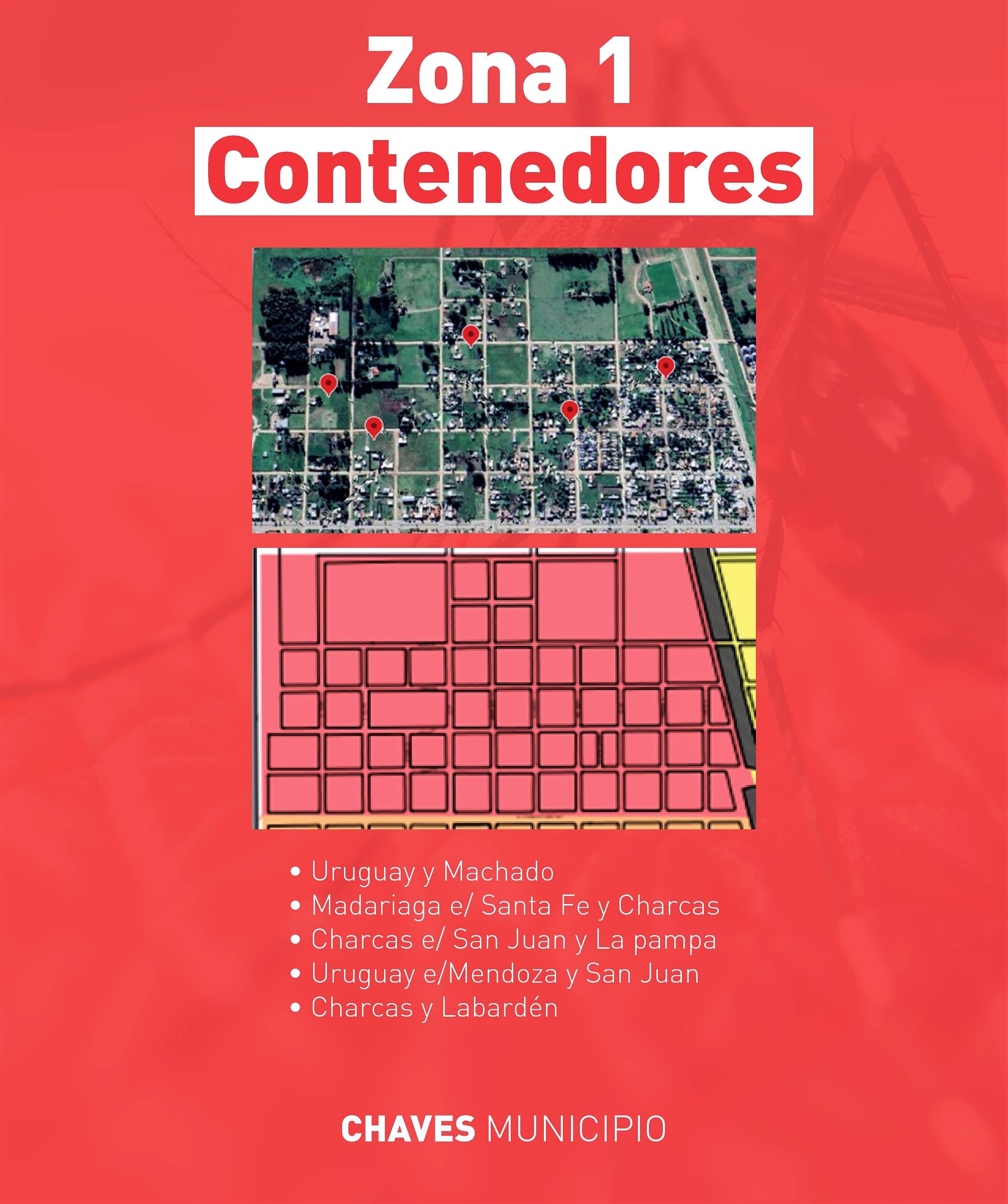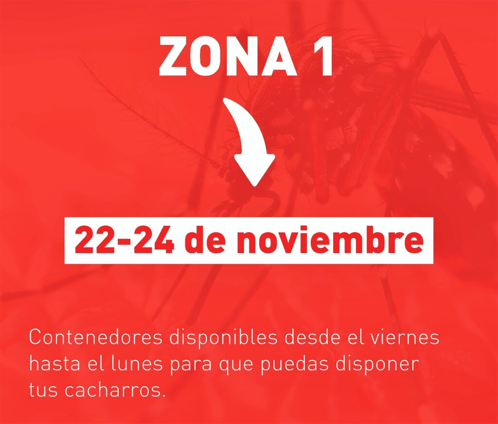 En el marco de la estrategia de prevención del dengue, Chaves Municipio implementará el calendario de descacharre en la Zona 1 del 22 al 24 de noviembre. Los vecinos y vecinas podrán disponer sus cacharros en los contenedores que estarán ubicados estratégicamente en los siguientes puntos: