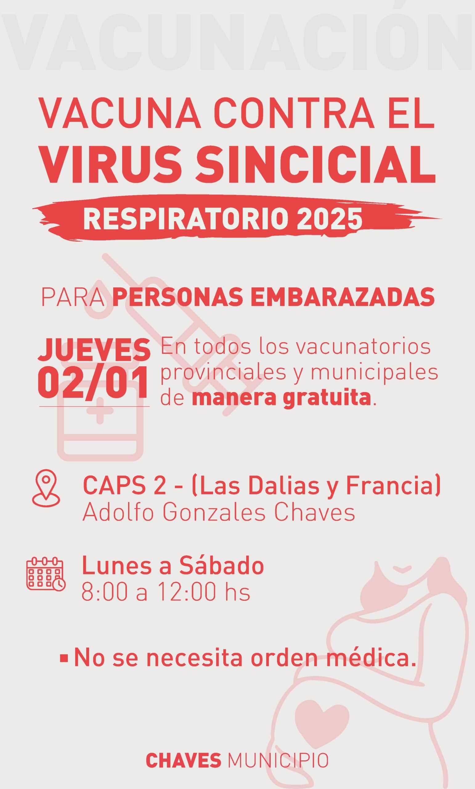 El Ministerio de Salud de la Nación ha establecido que el período de vacunación contra el Virus Sincicial Respiratorio (VSR) comenzará en el mes de enero. La vacuna está dirigida a personas embarazadas que se encuentren entre las 32 y 36 semanas y 6 días de gestación.