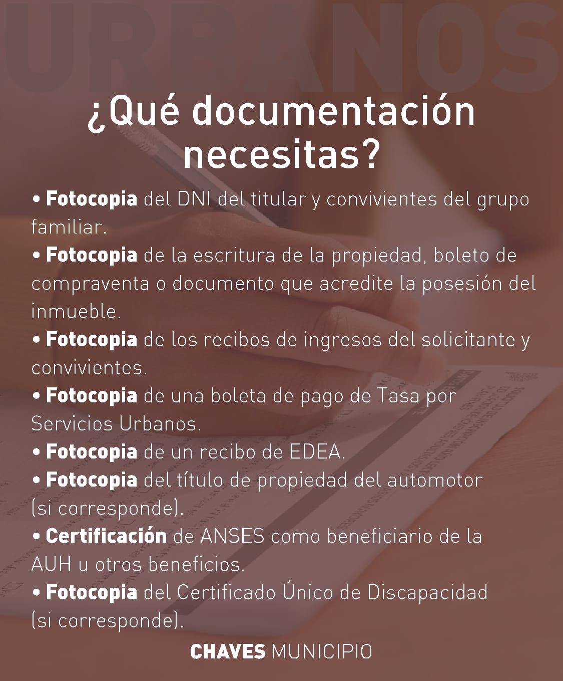 La Subsecretaría de Desarrollo Económico, Social y Comunitario junto con la Dirección de Ingresos Públicos de Chaves Municipio recuerdan que continúa abierta la inscripción para la eximición de la Tasa de Servicios Urbanos hasta el 29 de noviembre.