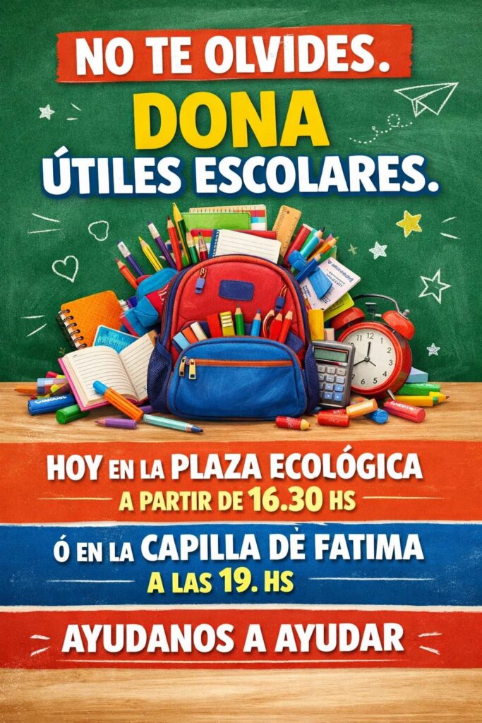 En el marco de la Misión de Seminaristas y como cada año, la comunidad parroquial a través del Movimiento Juvenil y Cáritas realiza la Campaña de útiles escolares. Podés acercar tu donación, hoy, a partir de las 16:30 horas en la Plaza Ecológica o en Capilla de Fátima; también podés ponerte en contacto con referentes de la parroquia.
