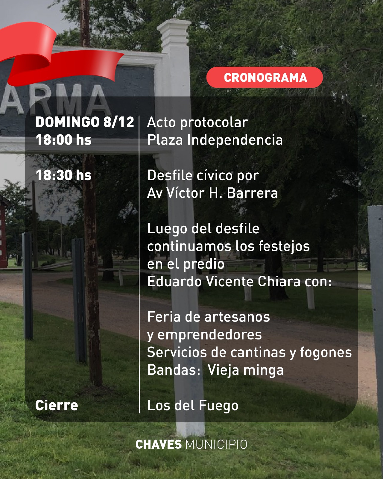 • Domingo 8/12: A las 18:00 hs. se llevará a cabo el acto protocolar en la Plaza Independencia, seguido por el Desfile Cívico en la Avenida Víctor H. Barrera. Los festejos cerrarán en el Predio Eduardo V. Chiara con fogones, cantinas y las actuaciones de las bandas Vieja Minga y Los del Fuego.