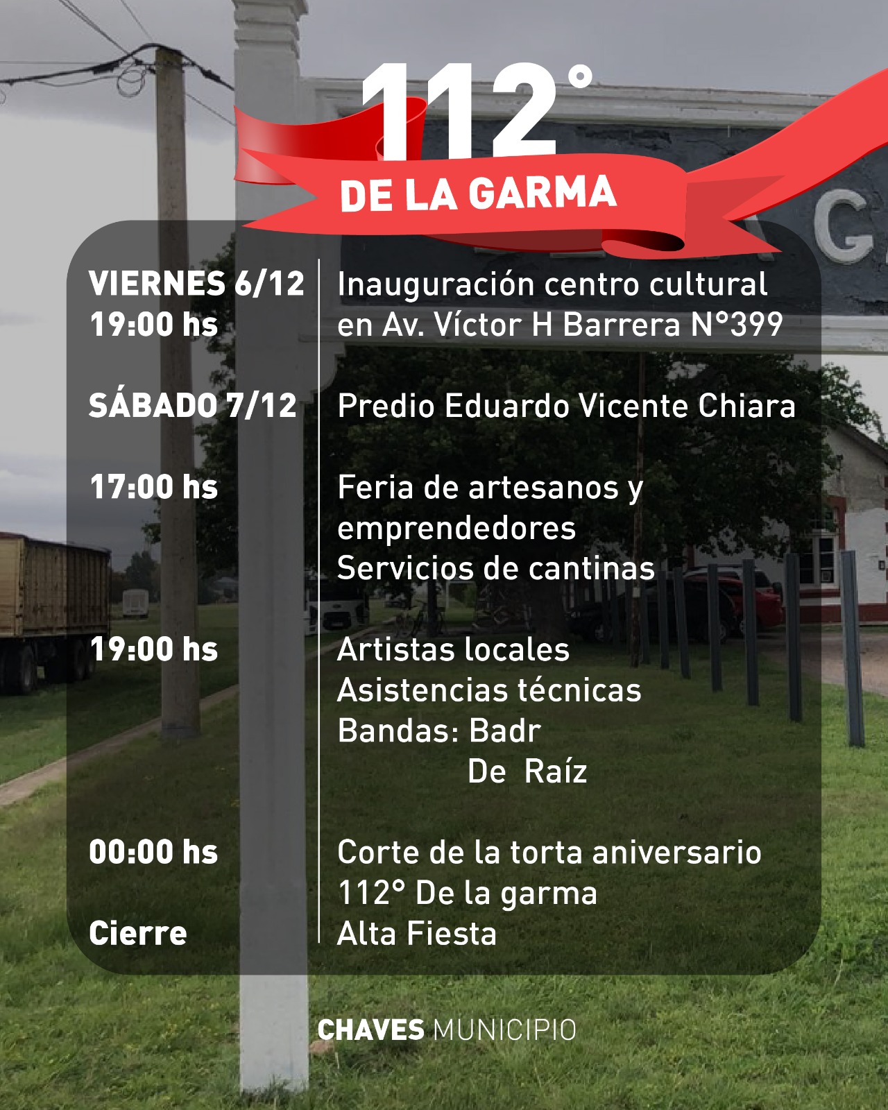 • Sábado 7/12: Desde las 17:00 hs., el Predio Eduardo V. Chiara será el punto de encuentro con la Feria de Artesanos y Emprendedores, servicio de cantinas, artistas locales, y las presentaciones de las bandas BADR y De Raíz. A las 00:00 hs., se realizará el tradicional corte de torta.