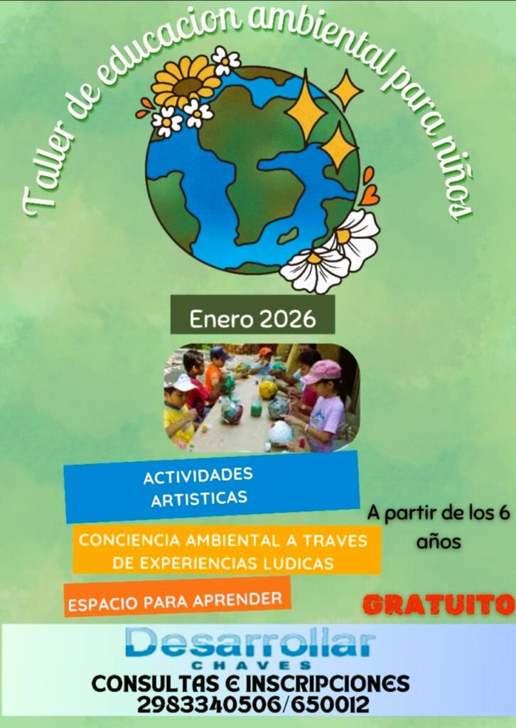 La ONG Desarrollar Chaves lanzará en la segunda semana de enero un Taller de Educación Ambiental para Niños, dirigido a menores de 6 a 12 años. El objetivo del taller es fomentar la conciencia ambiental y promover la creatividad en los niños a través de actividades artísticas y educativas.