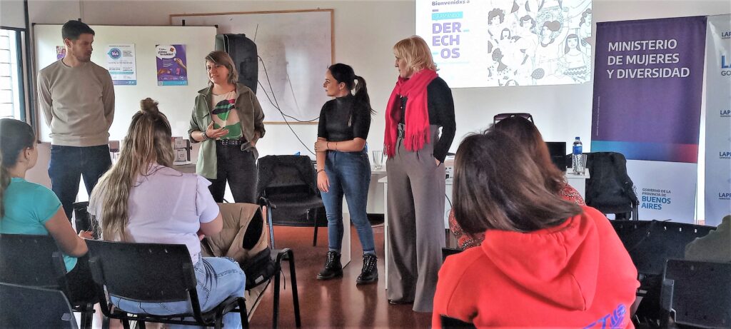 La Directora de la Región Sexta del Ministerio de Mujeres y Diversidad, Ximena Martel, junto a la Directora Provincial de Abordaje Territorial de Políticas de Género Nerina Favale y en articulación con las Direcciones de Género del Municipio de Adolfo Gonzáles Chaves y Laprida.
