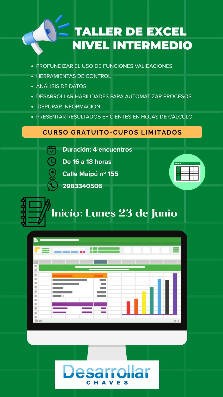 El Taller de Excel, nivel Intermedio inicia el lunes 23 de junio y está dirigido a quienes desean profundizar sus conocimientos en el manejo de funciones, herramientas de control y análisis de datos. Durante los encuentros, los participantes desarrollarán habilidades para automatizar procesos, depurar información y presentar resultados eficientes en hojas de cálculo.