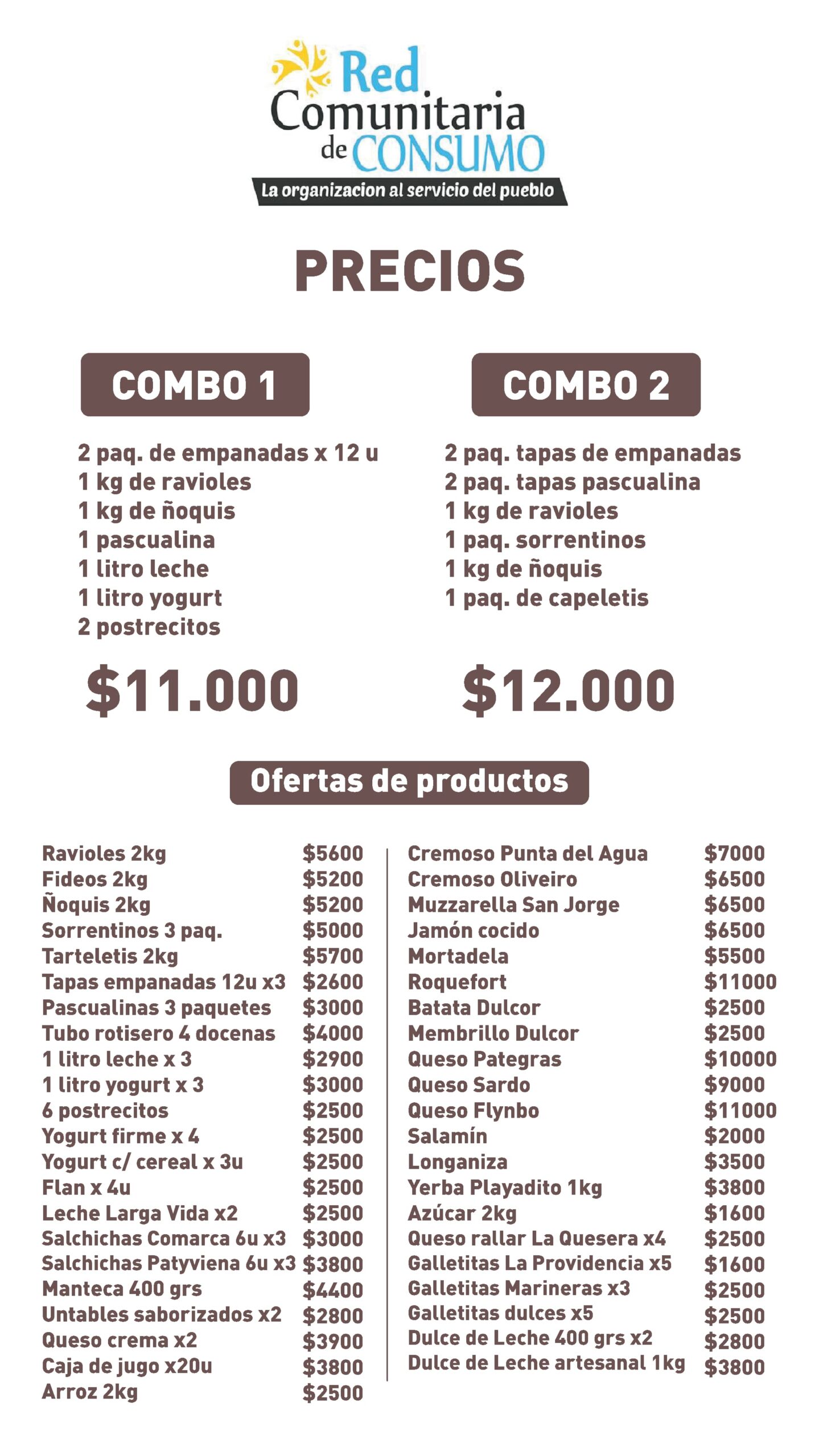 • Combo 1: empanadas, ravioles, ñoquis, leche, yogur y postres por $11.000.