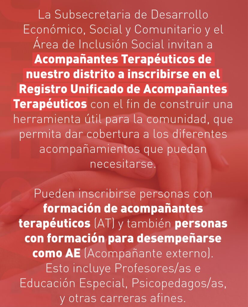 Este registro permitirá identificar a los profesionales disponibles y asegurar una cobertura adecuada de los acompañamientos que puedan requerirse en el distrito. Podrán inscribirse tanto personas con formación específica en Acompañamiento Terapéutico (AT), como aquellas formadas para desempeñarse como Acompañantes Externos (AE), incluyendo carreras afines como profesorado en Educación Especial y psicopedagogía, entre otras.