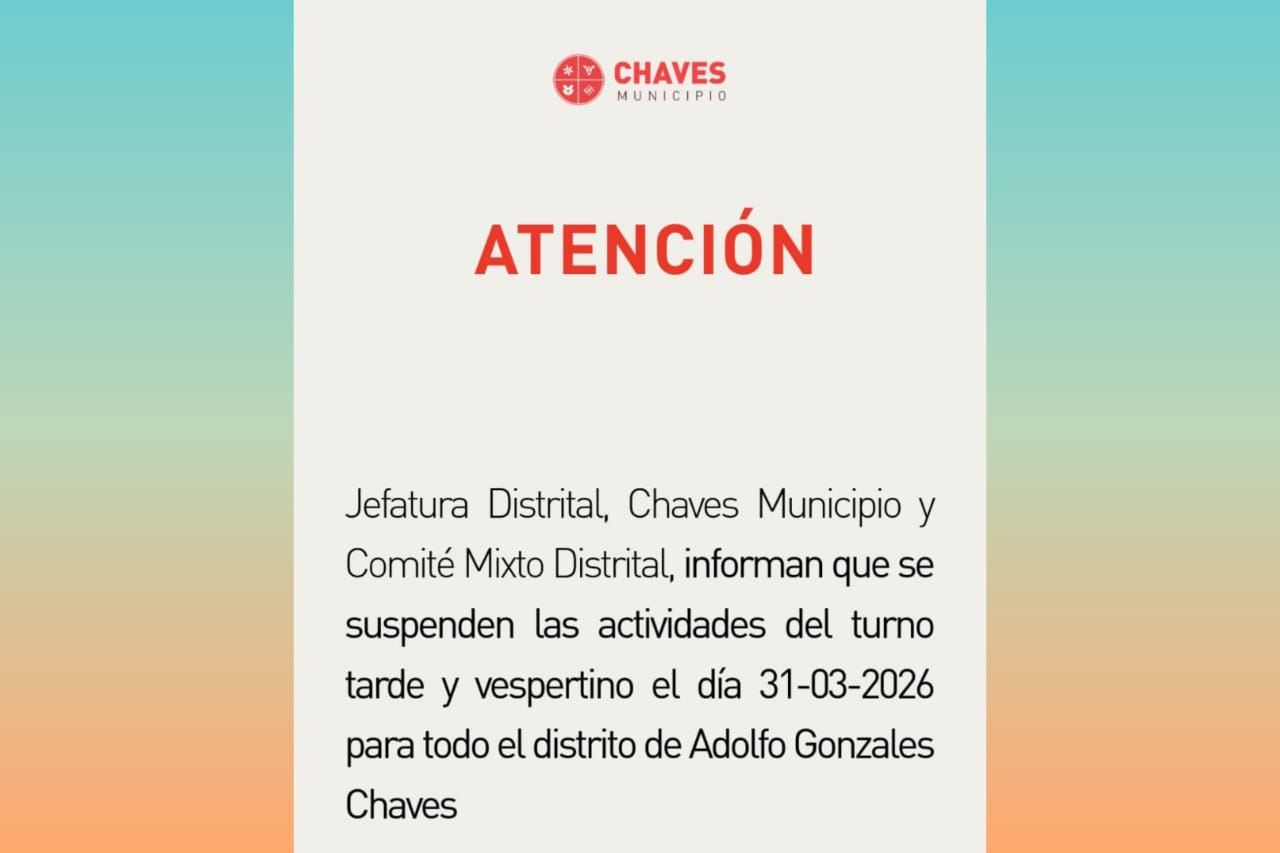 La Jefatura Distrital, en conjunto con Chaves Municipio y el Comité Mixto Distrital, informan a la comunidad que se ha dispuesto la suspensión de las actividades educativas en el turno tarde y vespertino para este martes 31 de marzo de 2026 en todo el distrito de Adolfo Gonzales Chaves.