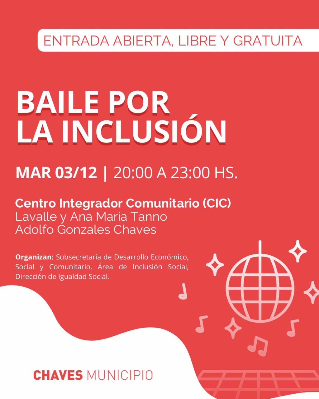 •🎶 Baile por la Inclusión: De 20:00 a 23:00 hs. en el Centro Integrador Comunitario (CIC), Lavalle y Ana María Tanno, para cerrar el día con música y alegría.