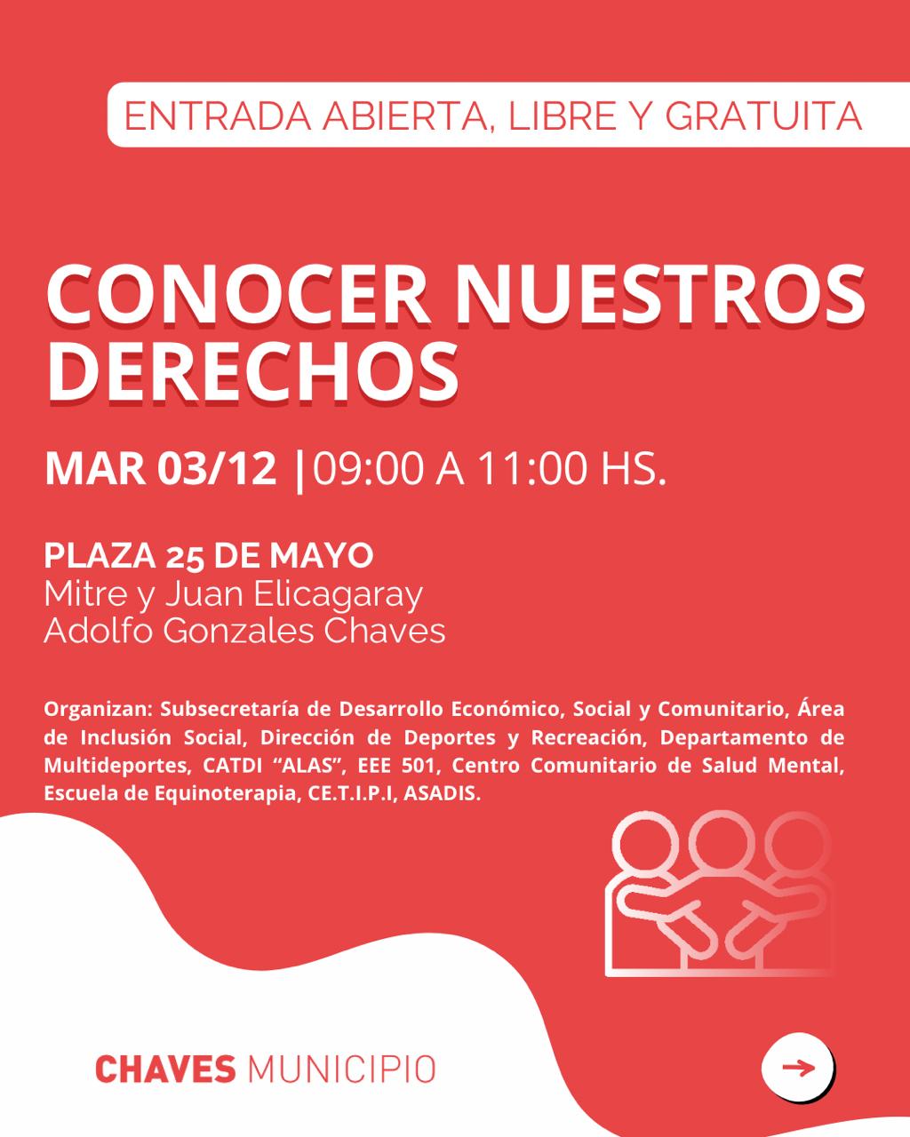 •🕘 Conocer nuestros derechos: De 9:00 a 11:00 hs. en la Plaza 25 de Mayo, se realizarán talleres y actividades organizadas junto a instituciones locales.