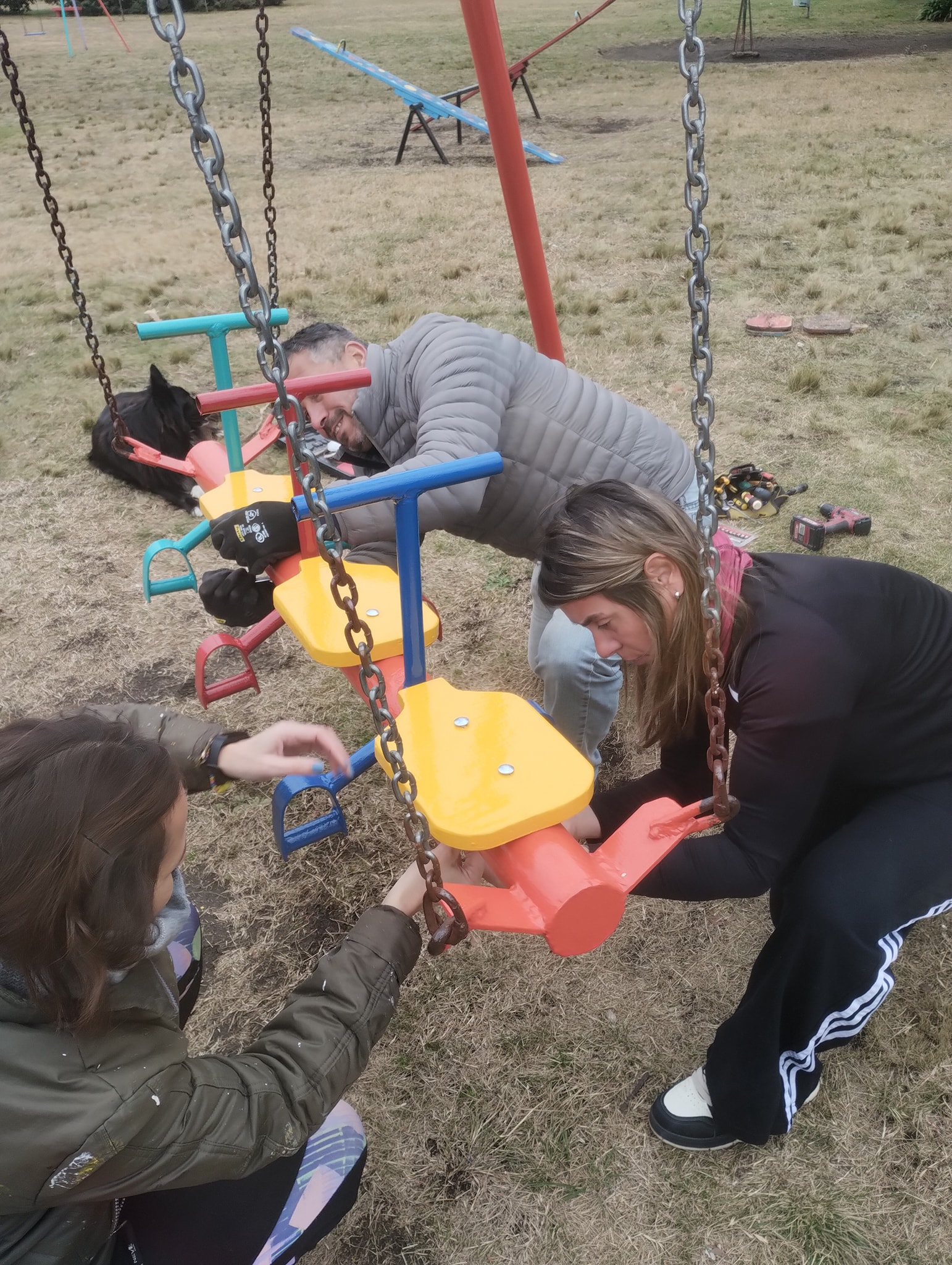 La tarea fue llevada a cabo por Georgina Martínez, Peche Marcelo y Leticia Pérez González, quienes trabajaron con entusiasmo para completar esta etapa tan esperada. La iniciativa contó con el valioso aporte de Herrería Paradisi, que donó los asientos de madera, y con la participación comprometida de vecinos que, durante los últimos dos meses, colaboraron en el pintado del juego.