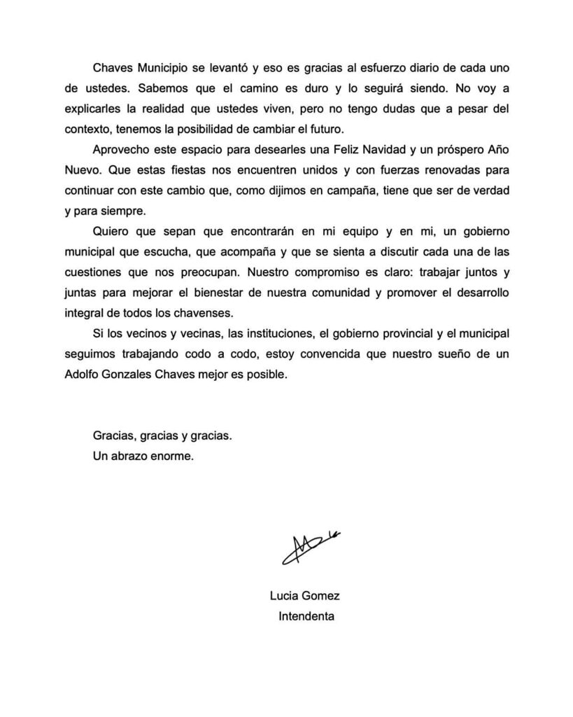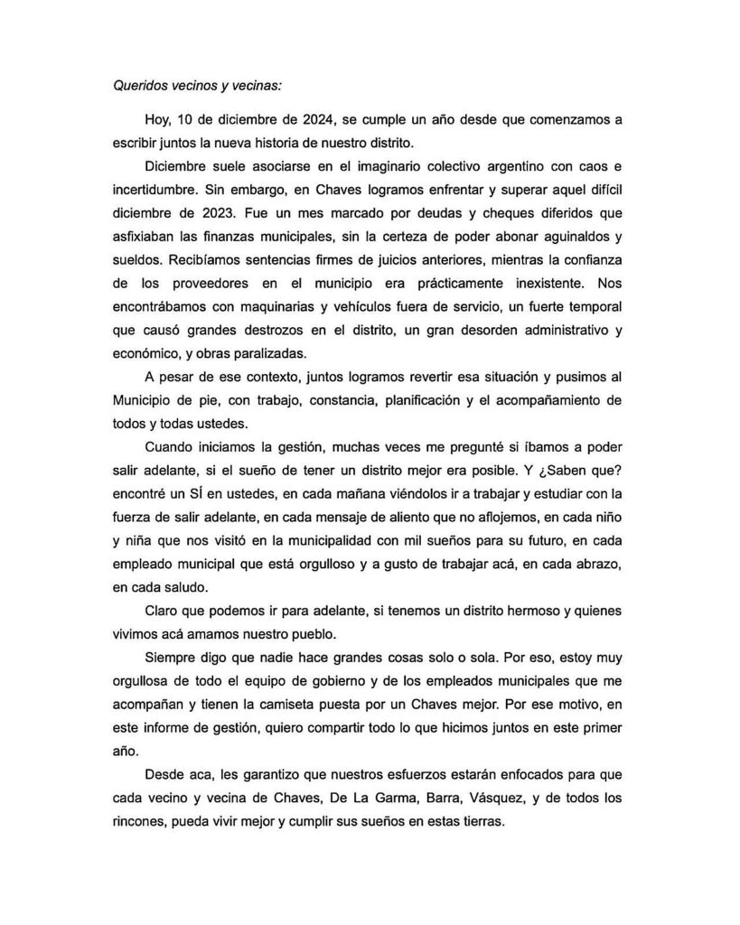 En una carta inicial, Lucía Gómez reflexionó sobre el difícil contexto con el que inició su gestión en diciembre de 2023, marcado por deudas, problemas financieros y desafíos administrativos, y destacó el esfuerzo colectivo que permitió revertir esa situación. “Juntos logramos revertir esa situación y pusimos al Municipio de pie, con trabajo, constancia, planificación y el acompañamiento de todos y todas ustedes”, expresó.