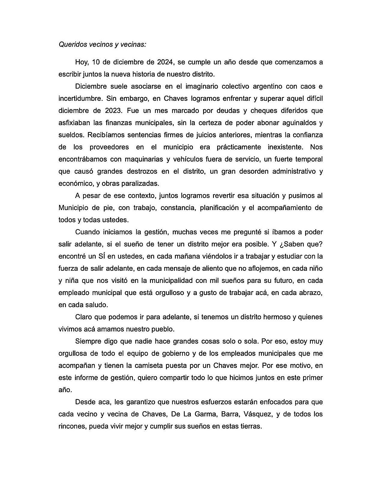 El informe aborda los principales hitos del primer año de gestión, incluyendo mejoras en obras públicas, orden económico, fortalecimiento de los servicios municipales y avances en las localidades de Chaves, De La Garma, Barra y Vásquez. También subraya el compromiso de su equipo con el bienestar de cada vecino y vecina.