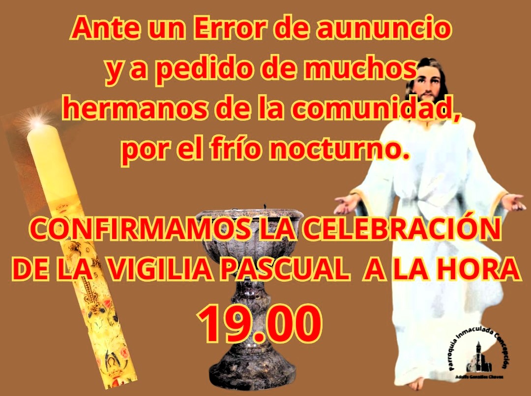 La Parroquia Inmaculada Concepción informó recientemente que, debido a un error en el anuncio inicial y a solicitud de numerosos miembros de la comunidad preocupados por las bajas temperaturas nocturnas, la celebración de la Vigilia Pascual se realizará a las 19 horas.