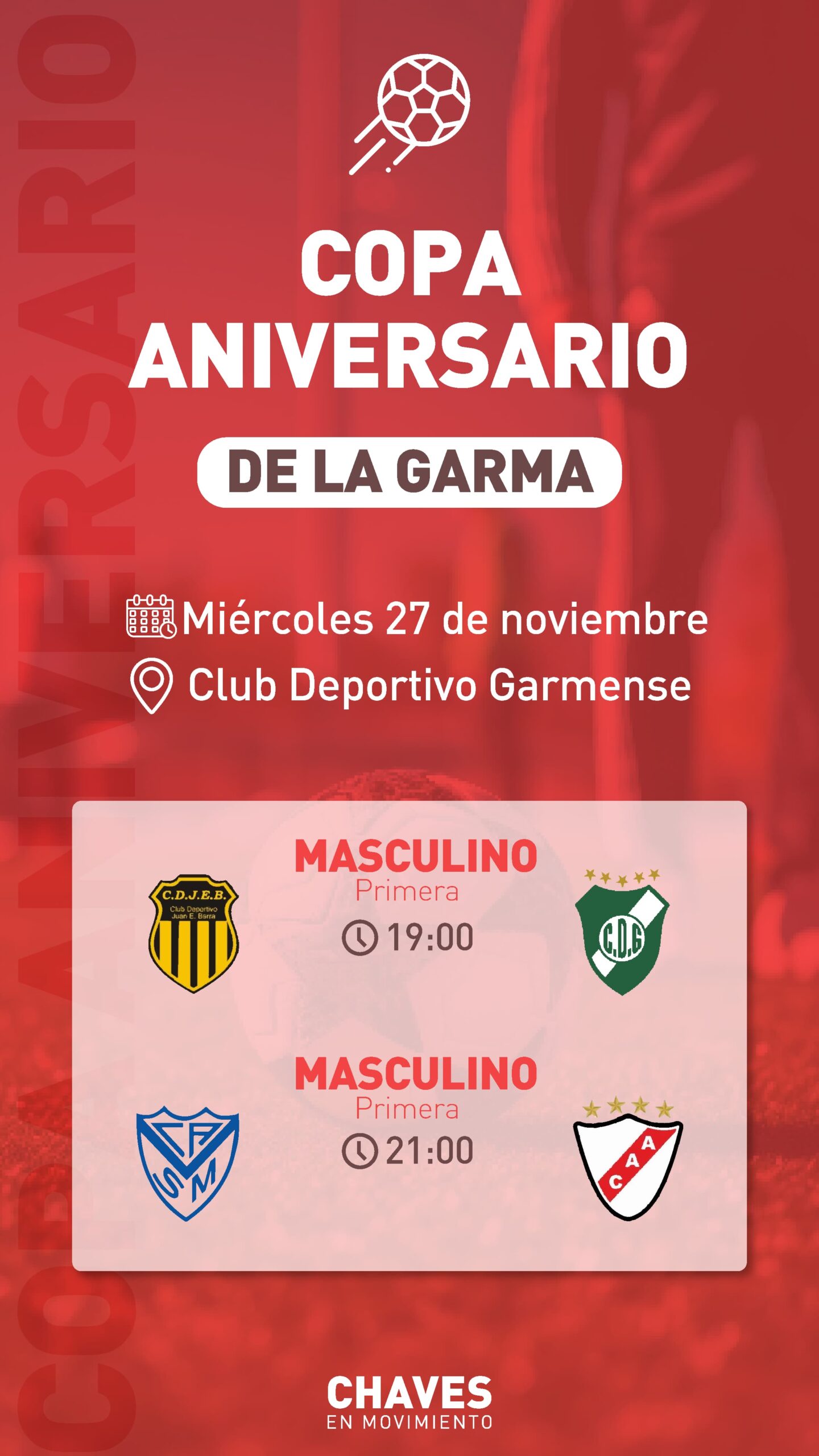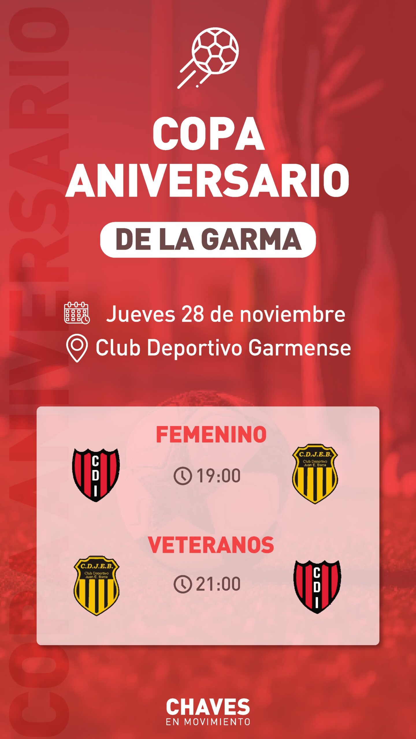 Este año, los partidos se disputarán en horario nocturno en la cancha del Club Deportivo Garmense, con la participación de las categorías Femenino, Veteranos y Primera Masculino.