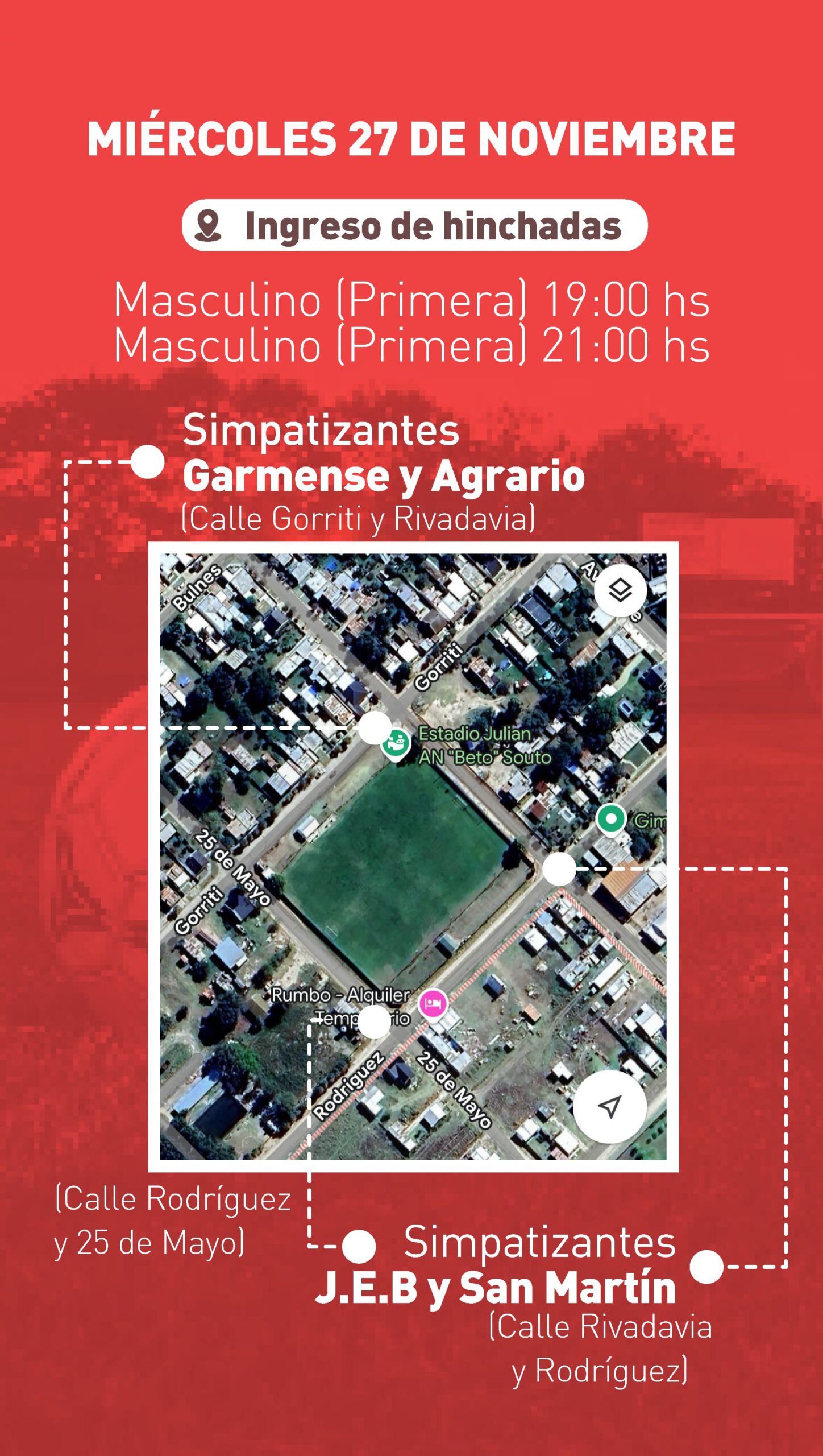 • 19:00 hs, Veteranos: Agrario vs. ganador del partido San Martín vs. Huracán Ciclista