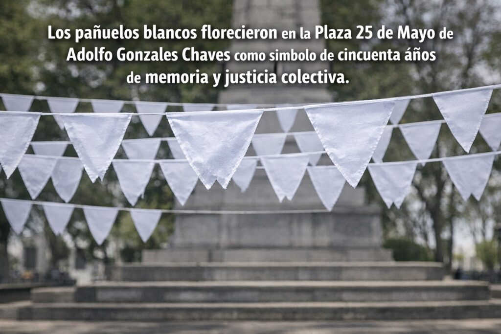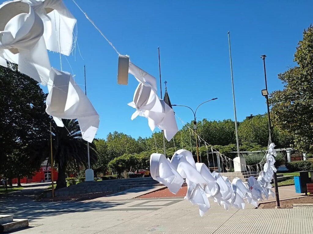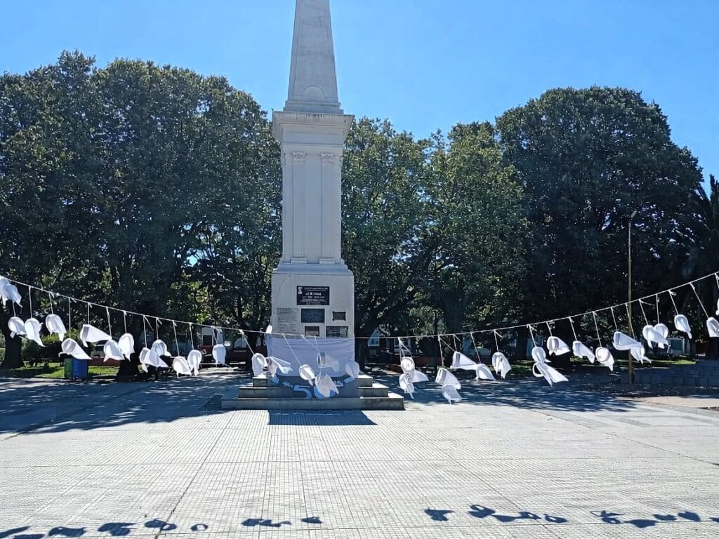 La plaza se vistió de pañuelos blancos colgando, símbolo de las Madres y Abuelas de Plaza de Mayo, pero también de la memoria viva que se construye colectivamente. No son solo pañuelos: son años, son manos locales que los hicieron, los pensaron y los colgaron.
