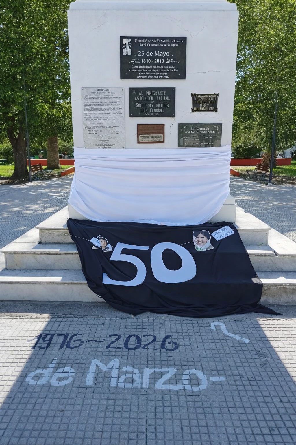 En el marco del Día Nacional de la Memoria por la Verdad y la Justicia, la comunidad de Adolfo Gonzales Chaves realizó una intervención artística en la Plaza 25 de Mayo para recordar los 50 años del golpe militar de 1976.