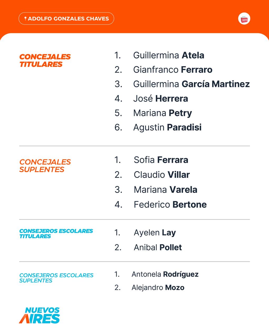 La intendenta Lucía Gómez oficializó a través de sus redes sociales el equipo de concejales y consejeros escolares que representará al espacio Nuevos Aires en las elecciones del próximo 7 de septiembre en Adolfo Gonzales Chaves.