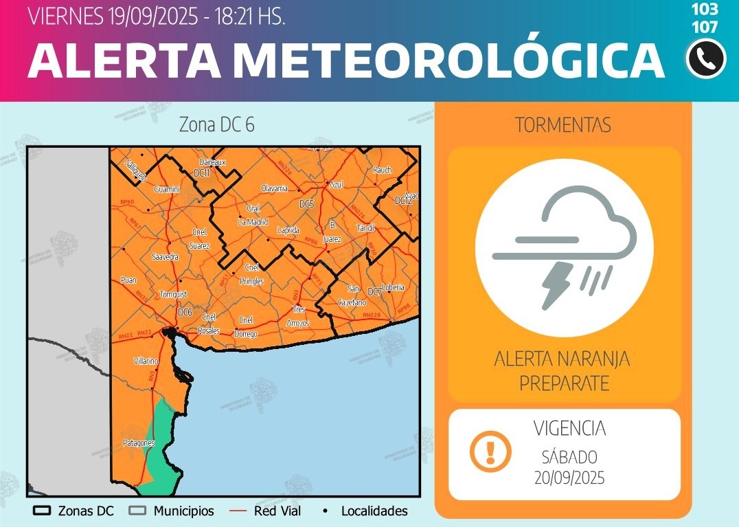 Sábado 20: Se esperan lluvias y tormentas. Algunas pueden ser localmente fuertes especialmente sobre el norte de la zona entre la mañana y la primera mitad de la tarde, aproximadamente entre las 6-7 hs y las 17-18 hs. Se prevén acumulados de 30 a 50 mm, que podrían superarse de forma localizada. Además se pueden registrar ráfagas fuertes de forma localizada y no se descarta la caída de granizo pequeño de manera aislada. Hacia el final de la tarde y la noche, se prevé una disminución en la intensidad de los fenómenos quedando la zona con lluvias y lloviznas remanentes.