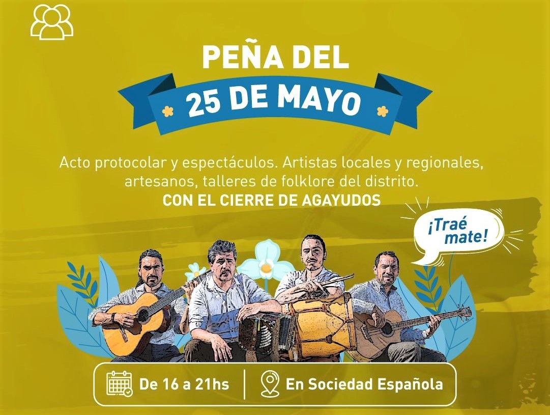 La Municipalidad de Adolfo Gonzales Chaves invita a la población a sumarse a la Peña del 25 de mayo que se desarrollará en el Salón de la Sociedad Española. Con la organización de la Dirección de Cultura y la Peña Añoranzas, se realizará el Acto Protocolar para luego dar paso a los diferentes espectáculos artísticos programados que tendrán el cierre con Los Agayudos. Además, habrá para disfrutar en familia Artesanos y Talleres de Folklore. La cita es de 16 a 21 horas.