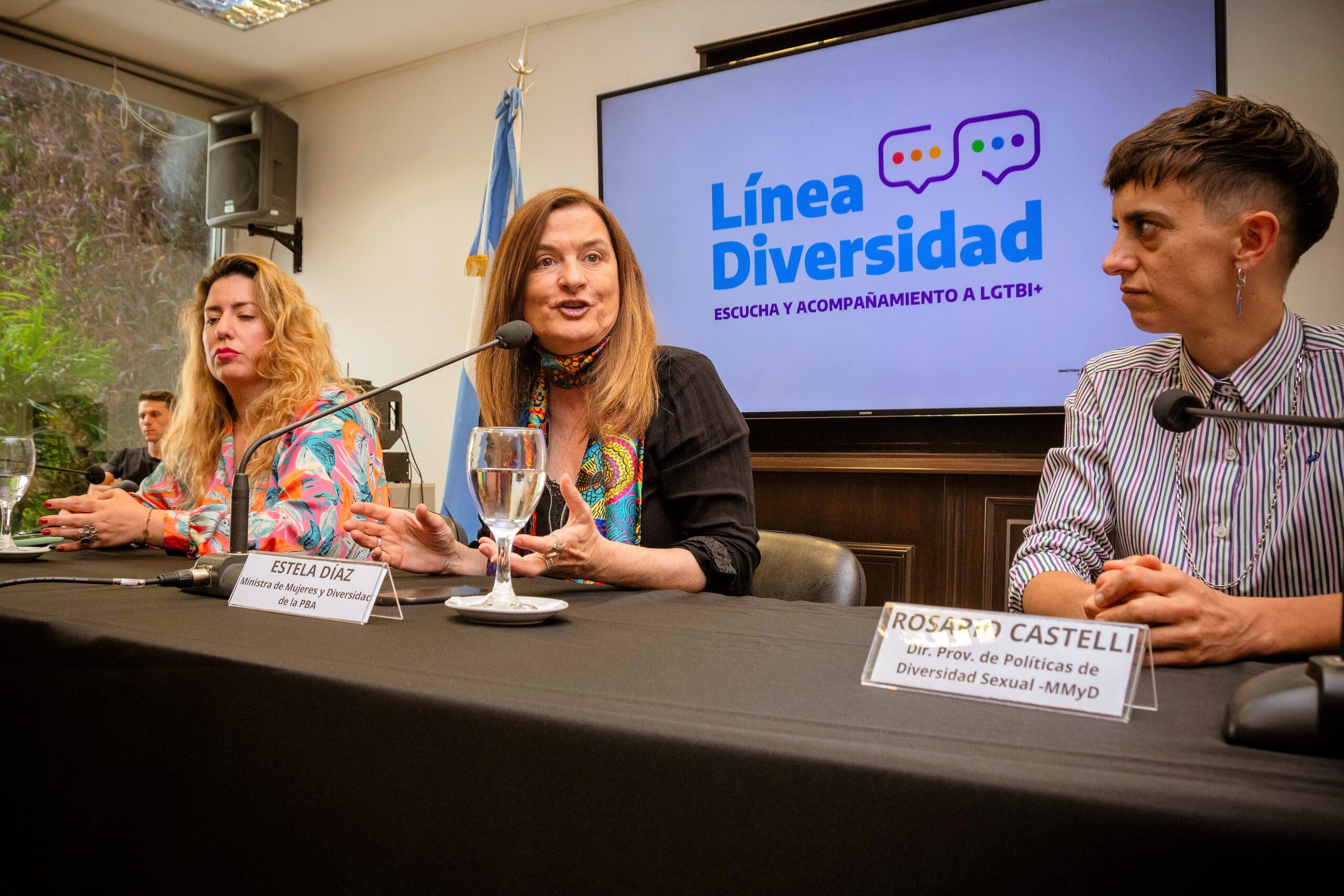 La ministra de Mujeres y Diversidad de la provincia de Buenos Aires Estela Díaz, junto a la subsecretaria de políticas de Género y Diversidad Sexual Lucía Portos y la directora provincial de Diversidad Sexual Rosario Castelli, presentaron la “Línea Diversidad” en el Anexo de la Honorable Cámara de Diputadas y Diputados bonaerense, una política para brindar apoyo, contención y asesoramiento a LGTBI+, instituciones y organizaciones de la Provincia.