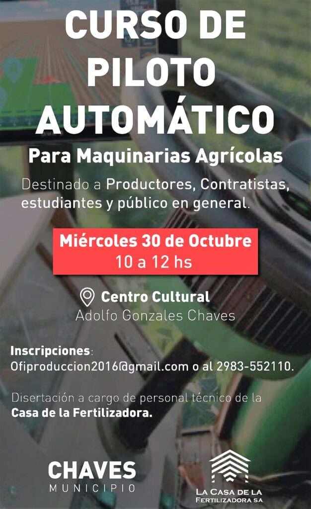 La Dirección de Producción de Chaves Municipio en conjunto con La Casa de Fertilizadora S.A preparan un curso para instaladores de pilotos automáticos a desarrollarse en las instalaciones del Centro Cultural.