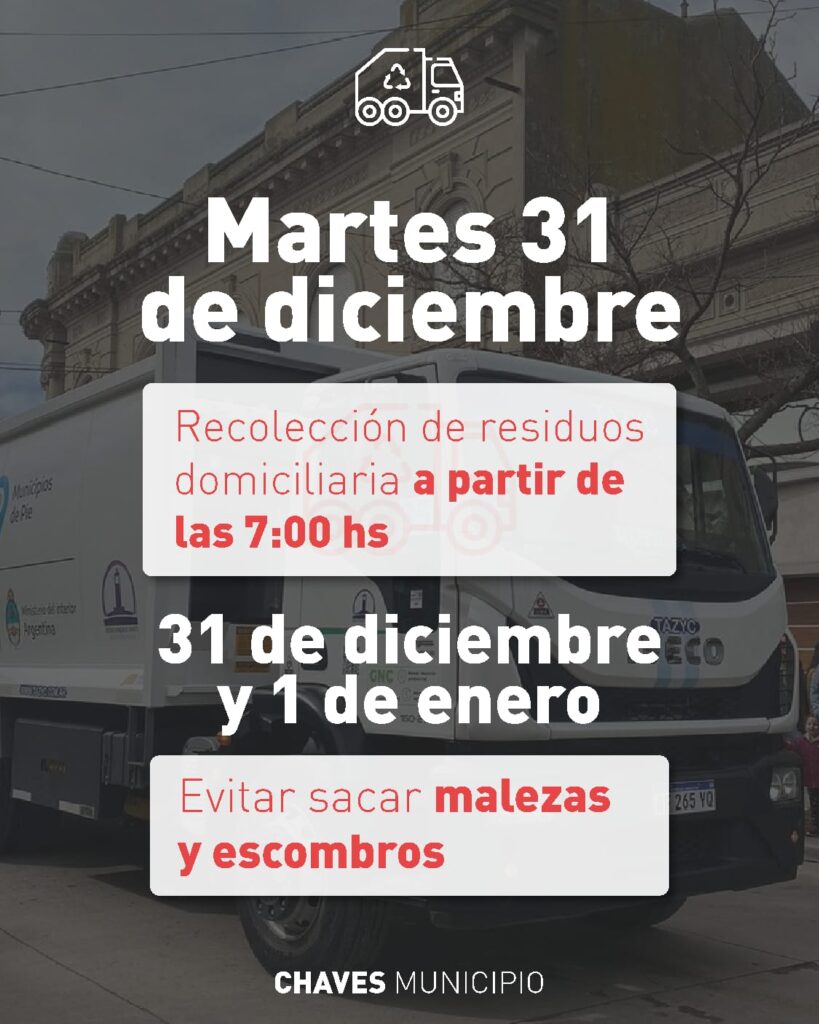 En un esfuerzo por mantener la ciudad limpia y ordenada durante las festividades de fin de año, la Municipalidad de Gonzáles Chaves ha anunciado que la recolección de residuos domiciliarios se llevará a cabo el 31 de diciembre, a partir de las 7:00 hs.