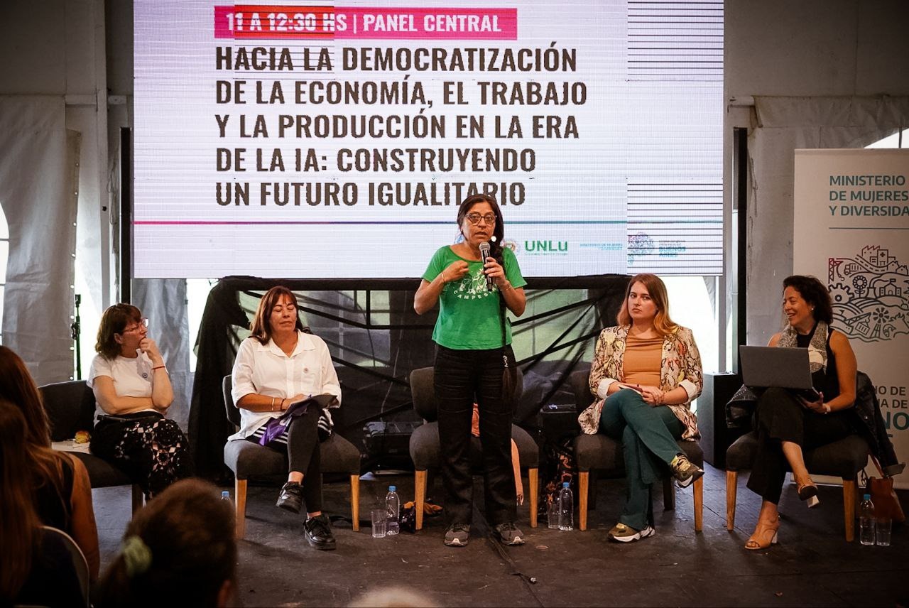 Más tarde, se desarrolló el panel central “Hacia la democratización de la economía, el trabajo y la producción en la era de la IA: construyendo un futuro igualitario”, con la exposición de la especialista en Políticas de Empleo y Género de la OIT, Valeria Esquivel; la subsecretaria del Ministerio de Ambiente, Jackie Flores; la referenta del MOCASE Vía Campesina, Deolinda Carrizo; y la economista y comunicadora, Candelaria Botto. El intercambio fue moderado por la ministra de Hábitat y Desarrollo Urbano, Silvina Batakis, y abordó las dificultades que enfrentan las mujeres y LGTBI+ para el acceso al trabajo, a la tierra, a un ambiente sostenible, en un contexto en el que las transformaciones tecnológicas profundizan las desigualdades de género. También se intercambiaron estrategias posibles para garantizar mayores estándares de igualdad y ejercicio de los derechos.