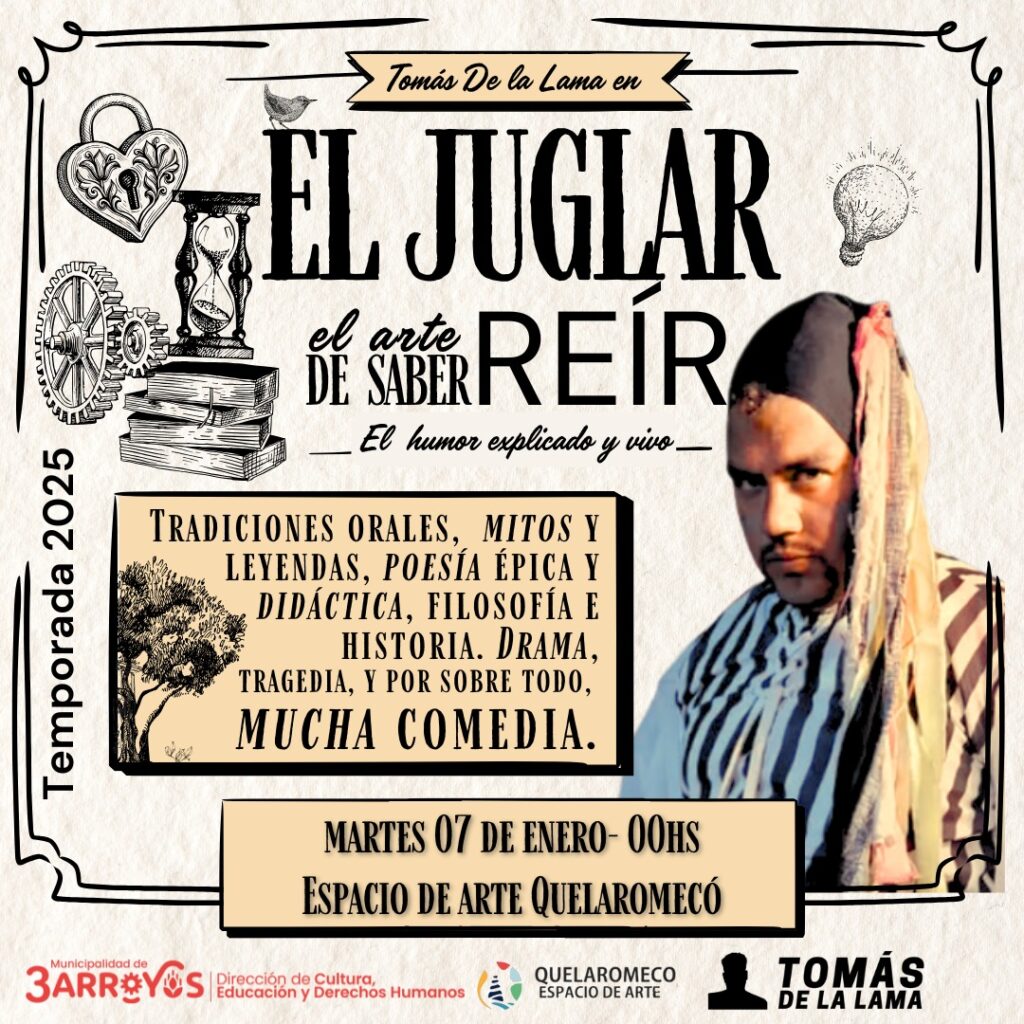 Este martes 7 de enero, se llevará a cabo el espectáculo «El Juglar» de la mano del reconocido actor y director Tomás De la Lama, quien nos trae un show en el que el humor y la risa se explican y se viven de manera intensa, rescatando en escena a esos viejos juglares que, en tiempos memorables, eran los encargados de entretener y divertir a toda la sociedad.